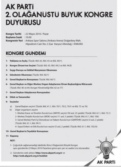 AK Parti'nin 22 Mayıs'ta yapılması kararlaştırılan ikinci oIağanüstü büyük kongresine ilişkin duyuruya, partinin internet sitesinde yer verildi.