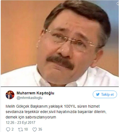 İstanbul Büyükşehir Belediye (İBB) Başkanı Kadir Topbaş’ın cuma günü görevinden istifasını açıklamasının ardından Ankara Büyükşehir Belediye Başkanı Melih Gökçek’in Twitter hesabından yayınladığı mesaja, AK Partili İBB ve Beykoz Belediyesi Meclis Üyesi Muharrem Kaşıtoğlu’ndan ilginç bir yanıt geldi.