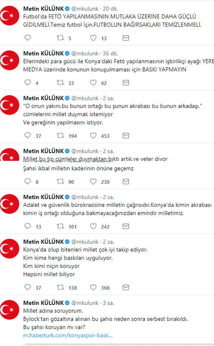 “Konya'da olup bitenleri millet çok iyi takip ediyor. Kim kime hangi baskıları uyguluyor, kim kimi niçin koruyor. Hepsini millet biliyor. Adalet ve güvenlik bürokrasisine milletin çağrısıdır, ‘Konya'da kimin akrabası kimin iş ortağı olduğuna bakmayacağınızdan emindir milletimiz.’ Millet bu tip cümleler duymaktan bıktı artık, ve yeter diyor. Kim olursa olsun hesabı sorulacaktır. Şahsi ikbal milletin kaderinin önüne geçemez. ‘O, onun yakını, bu, bunun ortağı, bu, şunun akrabası, bu, bunun arkadaşı’ cümlelerini millet duymak istemiyor. Ve gereğinin yapılmasını istiyor. Ellerindeki para gücü ile Konya'daki FETÖ yapılanmasının işbirlikçi ayağı yerel medya üzerinde konunun konuşulmaması için baskı yapmayın. Futbol'da FETÖ yapılanmasının mutlaka üzerine daha güçlü gidilmeli. Temiz futbol için futbolun bağırsakları temizlenmeli.”