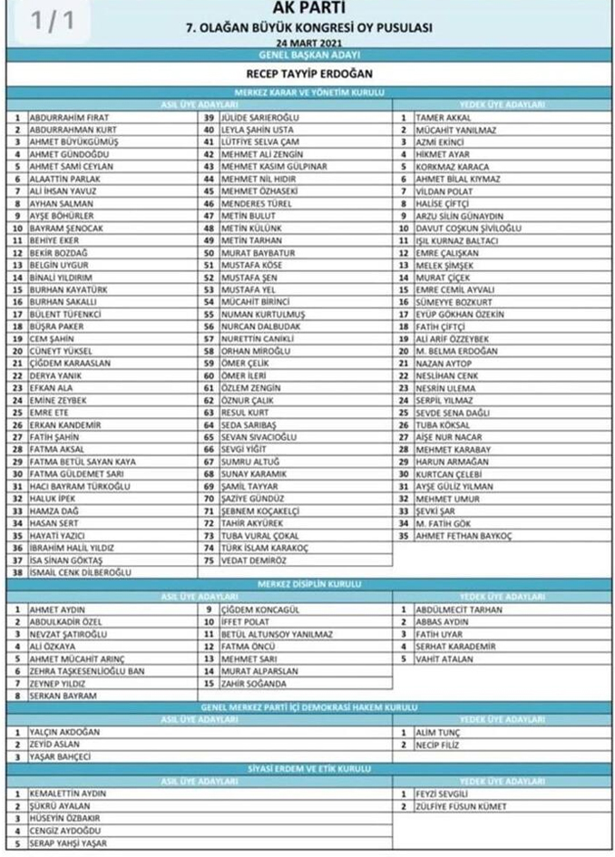 Partinin 75 üyeden oluşan Merkez Karar ve Yönetim Kurulu da aynı oylamayla belirlendi. AK Parti Genel Başkanlığına seçilen Erdoğan, teşekkür konuşması yaptı.