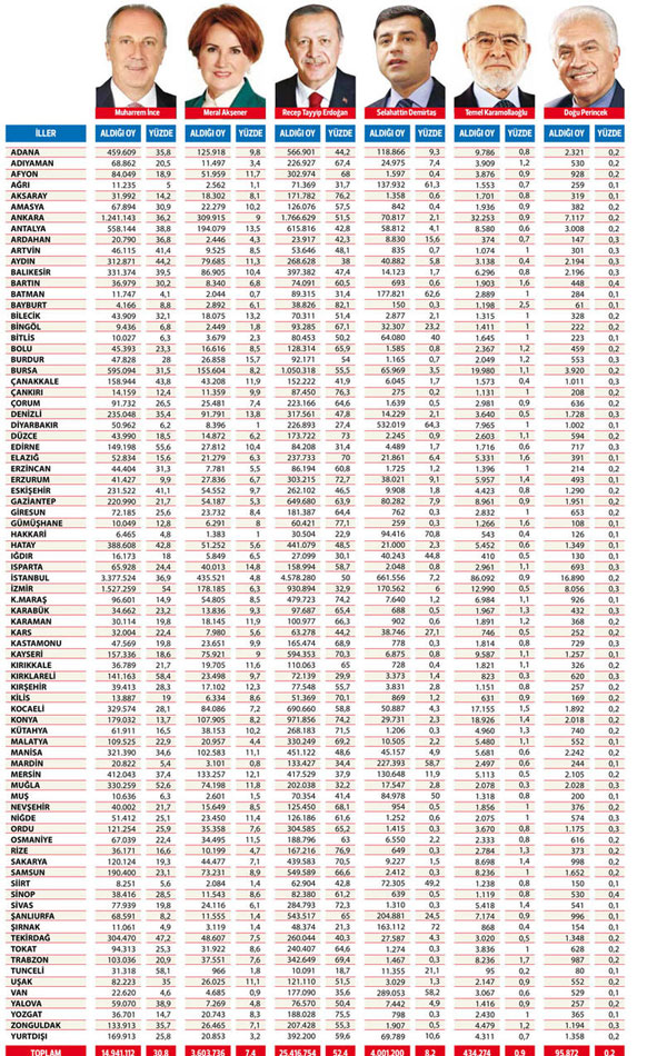 Erdoğan, İstanbul ve Ankara dahil 63 ilde en yüksek oyu alan aday olurken, İnce, Trakya ve Ege’deki 7 şehir ve Tunceli’de, Demirtaş ise Doğu ve Güneydoğu’daki 10 ilde birinci sırada yer aldı. Akşener ve Karamollaoğlu’nun birinci çıktığı seçim bölgesi olmadı. HDP’nin birinci çıktığı Muş’ta da Erdoğan Cumhurbaşkanı adayı olarak ilk sırada yer aldı.