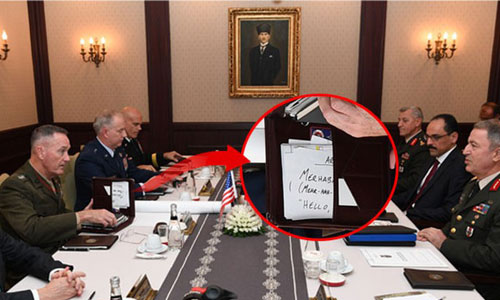 Görüşmeden bir detay ise dikkat çekti. Joseph Dunford'un dosyasında "merhaba" kelimesini söylemek için yaptığı heceleme çalışması objektiflere takıldı.