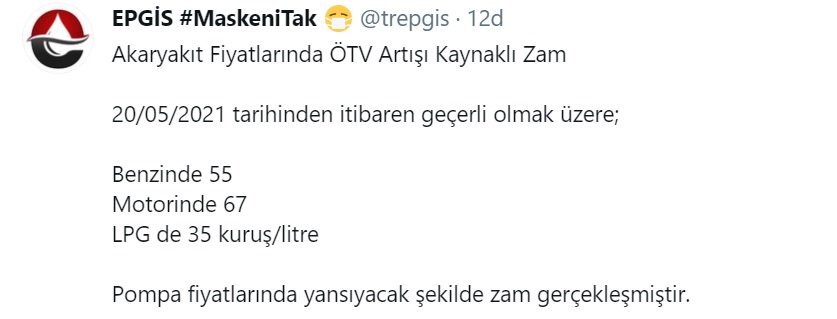 Enerji Petrol Gaz İkmal İstasyonları İşveren Sendikası (EPGİS) tarafından yapılan açıklamada vergi düzenlemesi sonrasında bugünden itibaren geçerli olmak üzere benzinin litre fiyatının 55 kuruş, motorinin 67 kuruş, LPG'nin ise 35 kuruş zamlandığını duyurdu.