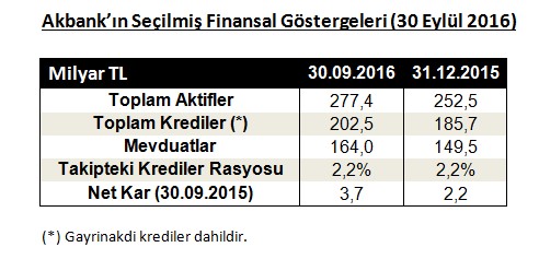 Akbank tarafından yapılan açıklamada, bankanın 2016 yılı ilk dokuz ayındaki finansal performansını değerlendiren Binbaşgil, global piyasalardaki zor koşullara rağmen, 3. çeyrekte de yüksek bir performans sergilemeyi başardıklarını aktararak, sağlam bilançoları ve yurt dışından sağladıkları uzun vadeli kaynaklarla ekonomiye desteklerini sürdürdüklerini kaydetti.