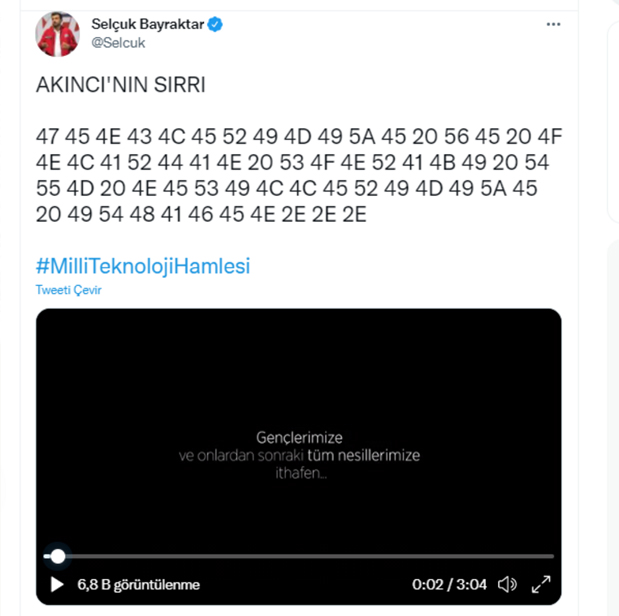 Selçuk Bayraktar, Akıncı'nın sırrına ilişkin sosyal medya hesabından önemli bir paylaşımda bulundu. Erdoğan'ın yazdığı bir mesaj Baykar'ın milli ve özgün olarak tasarlayıp geliştirdiği Bayraktar AKINCI TİHA’nın 6 Aralık 2019’daki ilk uçuşundan saatler önce uçuş kontrol bilgisayarının içindeki gömülü yazılıma eklendi.