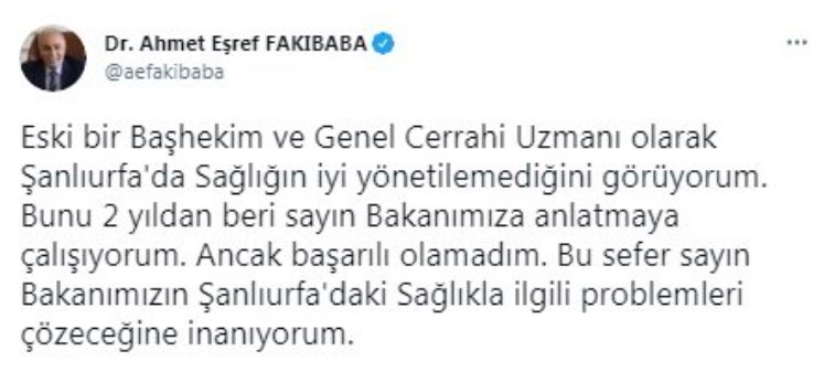 AKP’li vekil Ahmet Eşref Fakıbaba, şehrindeki sağlık sisteminin iyi yönetilmediğini belirterek Sağlık Bakanı Fahrettin Koca’ya sitem etti.