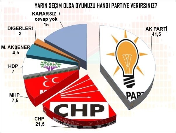 oyunuzu hangi partiye verirsiniz?" sorusuna verilen yanıtlarda kararsızlar dağıtılmaksızın Ak Parti yüzde 41.5, CHP yüzde 21.5, MHP yüzde 7.5, HDP yüzde 7, Akşener'in kuracağı iddia edilen parti yüzde 4,5, diğerleri başlığı altıda diğer parti ve bağımsız adayların ise yüzde 3'te kaldığı görüldü.