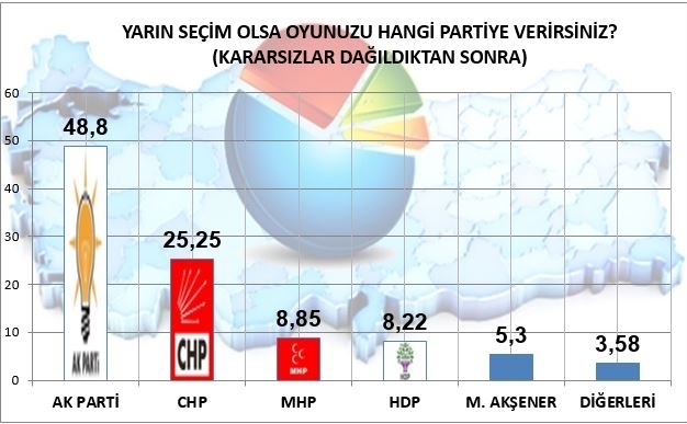 "Yarın seçim olsa oyunuzu hangi partiye verirsiniz?" sorusuna verilen yanıtlar; kararsızların partilere dağıtılmasından sonra Ak Parti yüzde 48,8, CHP yüzde 25.25, MHP yüzde 8.85, HDP yüzde 8.22 , Meral Akşener'in kuracağı iddia edilen partinin yüzde 5,3 diğerleri başlığı altıda kalan kısmın da yüzde 3.58'lik bir oy alacağı öngörülmektedir.