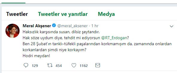 Erdoğan’ın bu sözlerine, Meral Akşener’den yanıt gecikmedi. Akşener twitter hesabından,’ Haksızlık karşısında susan, dilsiz şeytandır. Hak söze uydum diye, tehdit mi ediyorsun @RT_Erdogan ? Ben 28 Şubat’ın tanklı-tüfekli paşalarından korkmamıșım da, zamanında onlardan korkanlardan șimdi niye korkayım? Hodri meydan!” dedi.