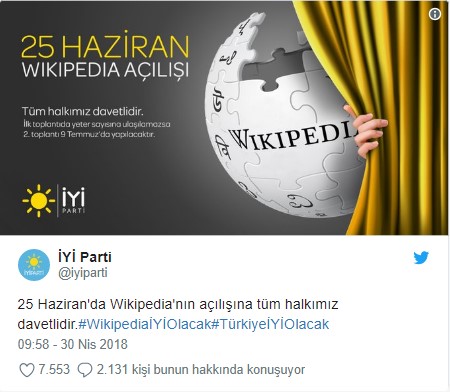 İYİ Parti resmi Twitter hesabı 24 Haziran seçimleriyle ilgili Wikipedia paylaşımı yaptı.