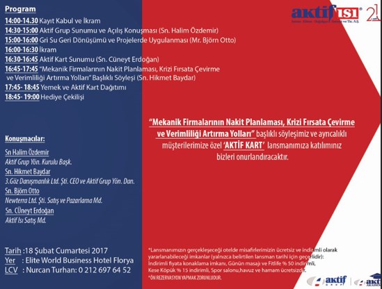 Aktif Grup Yönetim Kurulu Başkanı Halim Özdemir’in açılış konuşmasını yapacağı etkinliğin diğer konuşmacıları, 3. Göz Danışmanlık Ltd. Şti. CEO ve Aktif Grup Yönetim Danışmanı Hikmet Baydar, Newterra Ltd. Şti. Satış ve Pazarlama Müdürü Björn Otto ve Aktif Isı Satış Müdürü Cüneyt Erdoğan.