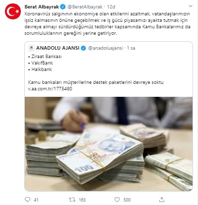 Bakan Albayrak, "Koronavirüs salgınının ekonomiye olan etkilerini azaltmak, vatandaşlarımızın işsiz kalmasının önüne geçebilmek ve iş gücü piyasamızı ayakta tutmak için devreye almayı sürdürdüğümüz tedbirler kapsamında Kamu Bankalarımız da sorumluluklarının gereğini yerine getiriyor." dedi.