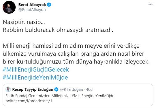 "Nasiptir, nasip. Rabb'im bulduracak olmasaydı aratmazdı. Milli enerji hamlesi adım adım meyvelerini verdikçe ülkemize vurulmaya çalışılan prangalardan nasıl birer birer kurtulduğumuzu tüm dünya hayranlıkla izleyecek."