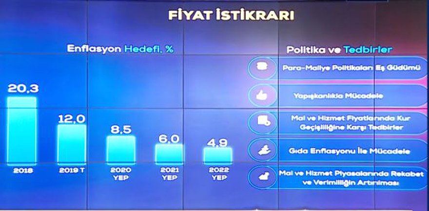 2019'u yüzde 12'lik enflasyon tahmini ile geride bırakmayı hedefliyoruz. 2020 yüzde 9.8'di yüzde 8 oldu. 2021 yüzde 6, 2022'de yüzde 4.9'luk enflasyon hedefliyoruz.
