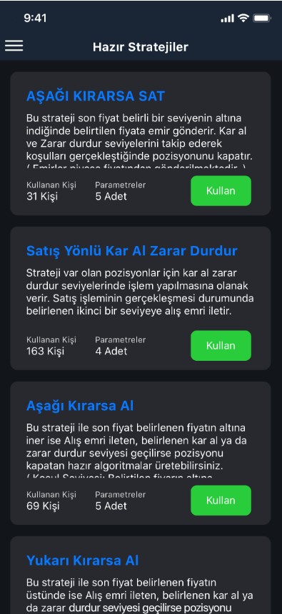 Türkiye’de algoritmik işlemlerin cep telefonuna indirilebildiği ilk hizmet olan ve Borsa İstanbul’da işlem yapan yatırımcıların hayatını kolaylaştıran uygulama ile müşteriler, güvenli bir platform üzerinde piyasaları sürekli takip etmek zorunda kalmadan yatırım fikirlerini hazırda bulunan ya da kendilerinin oluşturabileceği stratejiler yardımıyla tasarlayabilecek. ALGOLAB kullanıcıları böylece hazır olarak sunulan stratejilerden dilediklerini test ederek yatırım hesaplarında otomatik işlem yapması için talimat verebilecekler.