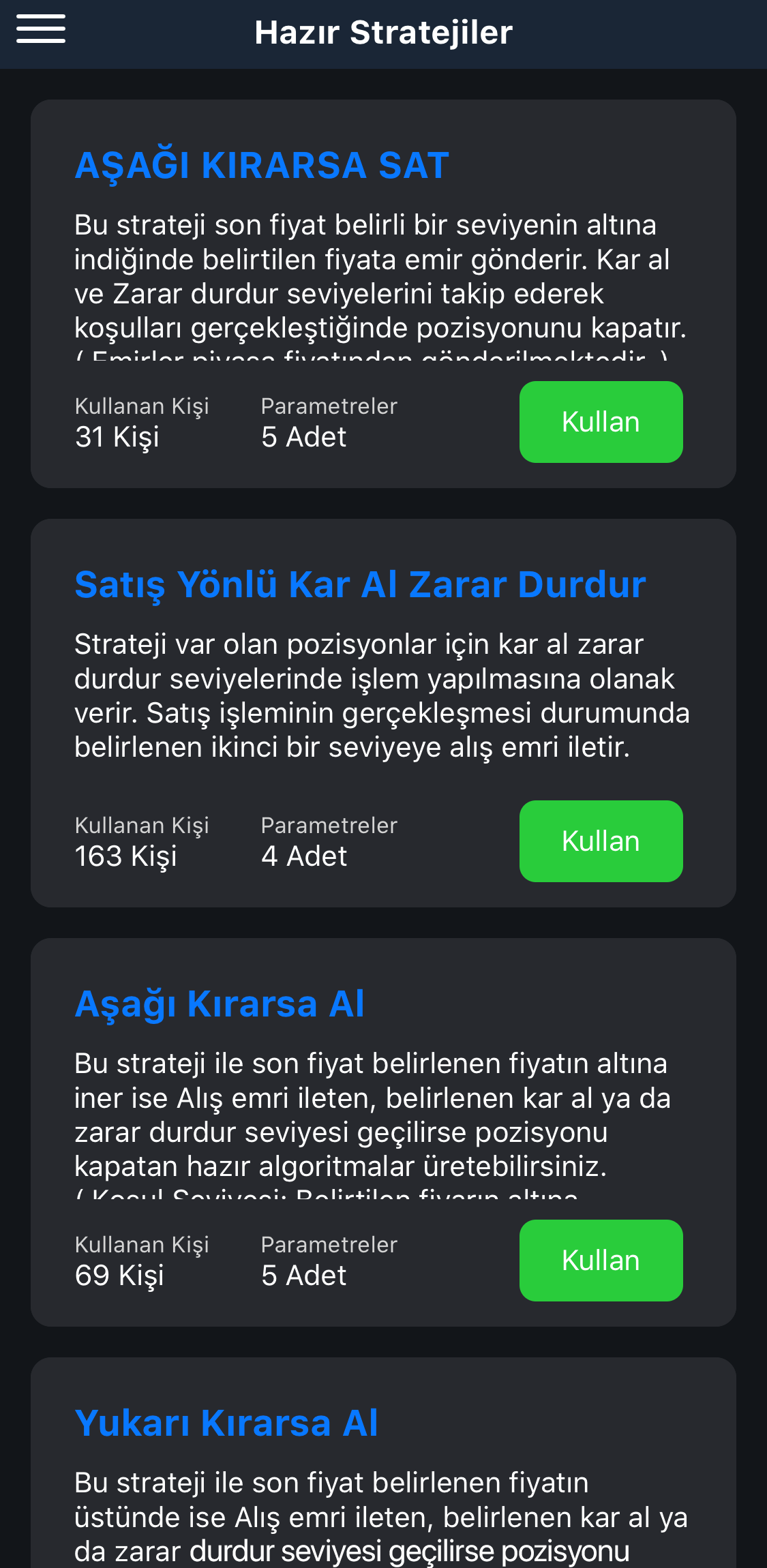 PRO sürümde; ‘Hazır Stratejiler’, ‘Sürükle Bırak’ ya da ‘Kodlama Editörü’nün yanında DropCopy Entegrasyonu özelliği ile borsada gerçekleşen emirlerin miktar ve durumlarına göre algoritma kurgulanabilecek. Yeni sürümle ayrıca piyasaların anlık takip edilip derinlik, alıcı-satıcı, bilanço verileri gibi detay bilgilerin görülmesi, emir girişinde Kar Al Zarar Durdur gibi özel tip emirler eklenmesi de mümkün olacak.