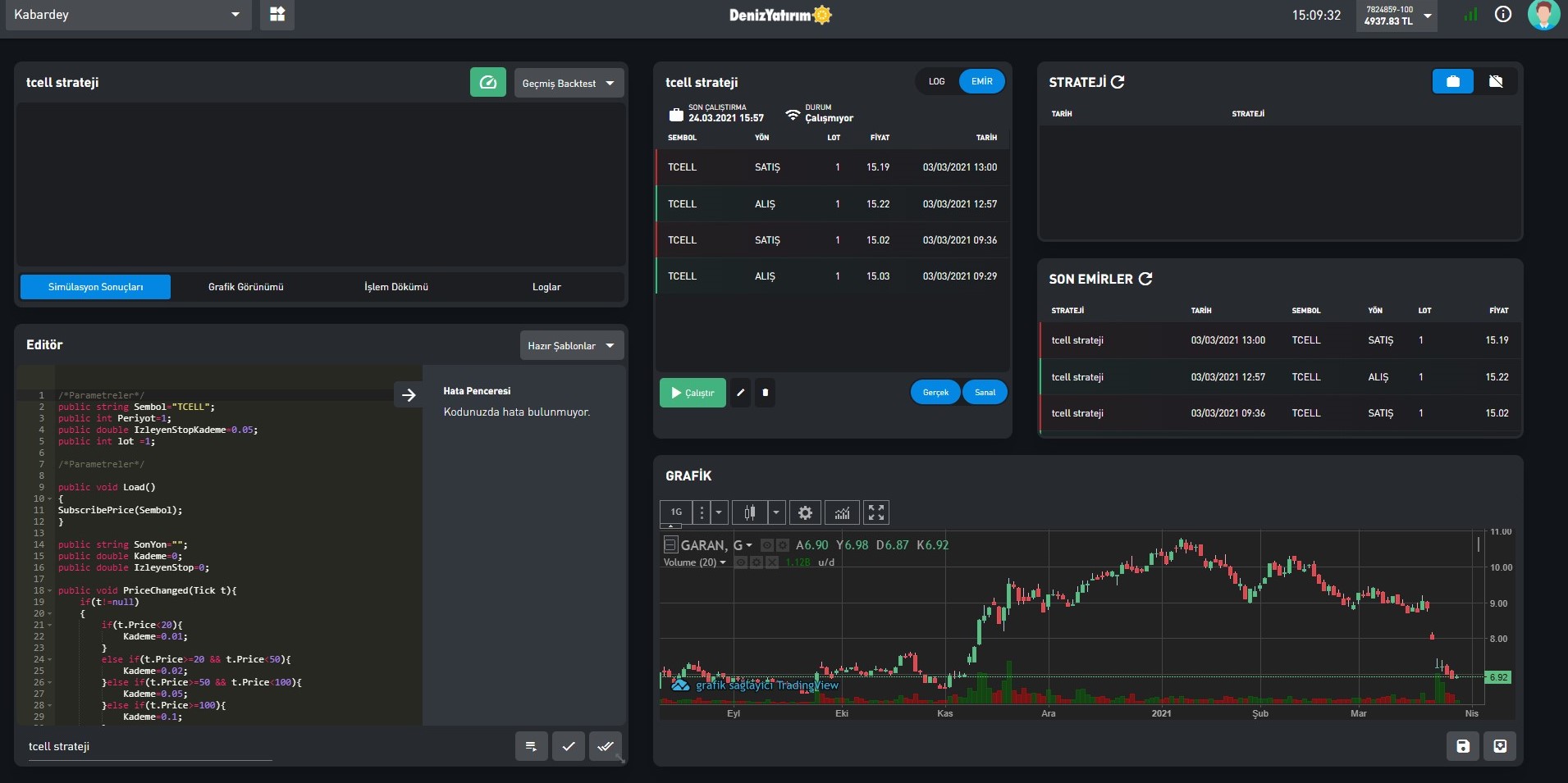 Yatırım konusunda tecrübesi bulunmayan kişilerden deneyimli yatırımcılara herkesin kullanımına açık platformda; yeni indikatör eklemeleri ile teknik kütüphaneden yararlanılabilecek, C# yazılım dilinde risk ve getirisine uygun sınırlamaların olmadığı algoritmalar oluşturulabilecek.