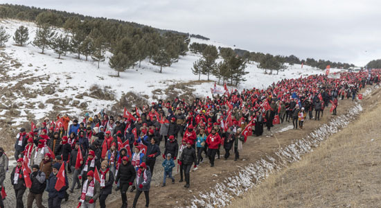 Ellerinde Türk bayrakları bulunan binlerce kişi, burada Kur'an-ı Kerim okuyup tekbir ve salavatlar getirerek şehitler için dua ettikten sonra soğuk havada Ay-Yıldızlı Tören Alanı'na doğru yürüyüşe geçti.