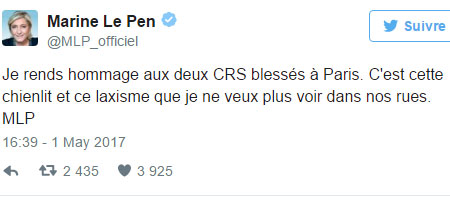 Olayların ardından Marine Le Pen bir tweet atarak yaralı polise geçmiş olsun diledi, cumhurbaşkanı olursa bu tür olaylara Fransa sokaklarında izin verilmeyeceğini öne sürdü.