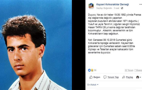 "Duyuru: Ne acı bir haber 19.06.1992 yılında Fransa Alp dağlarında dağcılık yaparken kaybolan, buzulların altında kalan 1971 doğumlu Yusuf ve Leyla Tarım’ın oğulları sevgili köylümüz Hasan Tarım 26 yıl sonra dağcılar tarafından bulunmuştur. Ailesinin, sevenlerinin ve tüm Kırkısraklıların başı sağolsun."