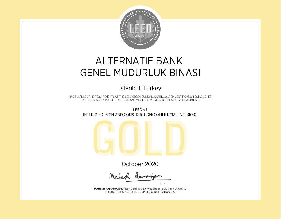 Alternatif Bank’ın, 13 bin m²’den fazla alana yayılan açık ofisleri, modern yaşam alanları ve çevresinde bulunan yeşil dokusuyla konforlu bir çalışma ortamı sunan Vadistanbul Genel Müdürlük binası, 150'den fazla ülkede kullanılan ve dünyanın en yaygın yeşil bina sertifikası olan LEED Gold Sertifikası’nı aldı.