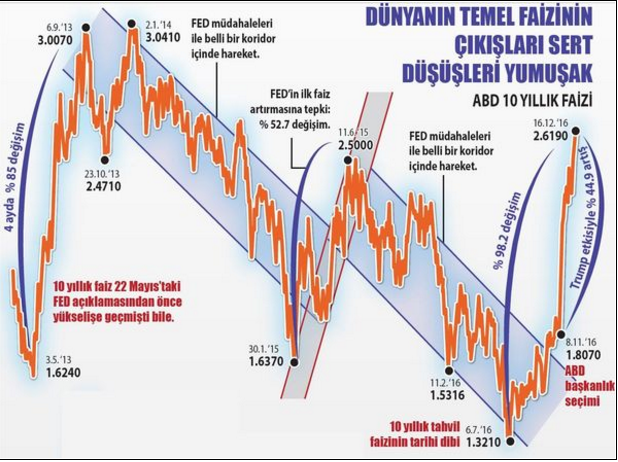 ABD başkanlık seçimini sürpriz şekilde Trump’ın kazanmasının ardından FED’in aralık ayında beklenen faiz artırımı geldi. FED toplantısının beklenmeyeni ise 2017 yılına ait faiz artış tahminlerinin ikiden üçe çıkarılmasıydı. Çünkü yeni ‘başkan’la ABD’de vergilerin düşürülmesi ve kamu altyapı yatırımlarının hızlandırılmasının büyümeyi, enflasyonu, istihdamı artırıcı etki yapacağı tahmin ediliyor.