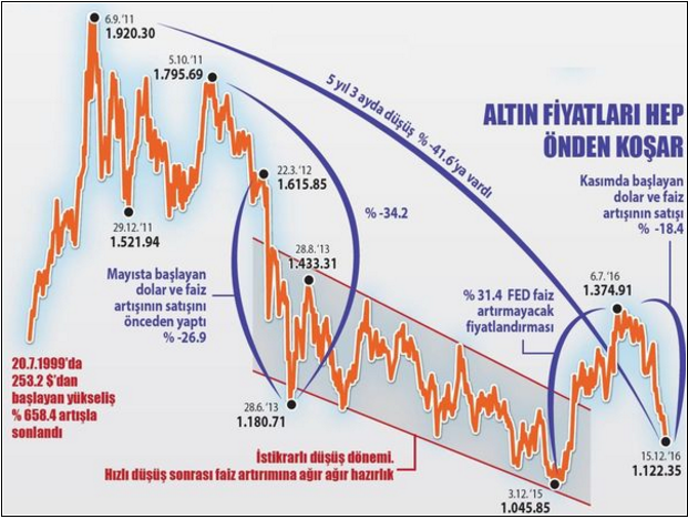 - Bu kez aralık itibarıyla görünen durum şu ki, düşmekte olan altın fiyatları, 2017’de yükselen dolar ve yükselen faiz oranlarıyla kurulacak yeni dengeye kendini ayarlıyor.