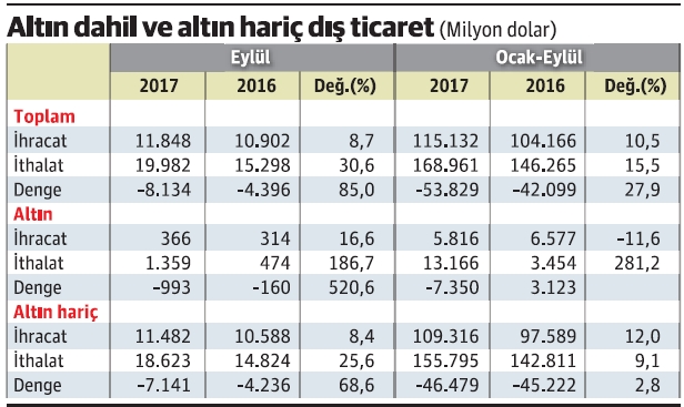 Türkiye geçen yılın ilk dokuz ayında 6.6 milyar dolarlık altın ihracatına karşılık 3.5 milyar dolarlık ithalat yapmıştı. Bunun sonucunda da altın ticaretinde 3.1 milyar dolarlık fazla elde edilmişti.