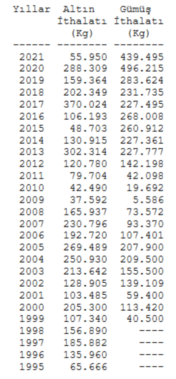 Borsa İstanbul Kıymetli Madenler Piyasası verilerine göre, aynı ayda gümüş ithalatı 76 bin 6 Kg oldu. Geçen yılın aynı ayında gümüş ithalatı 12 bin 657 Kg olmuştu.