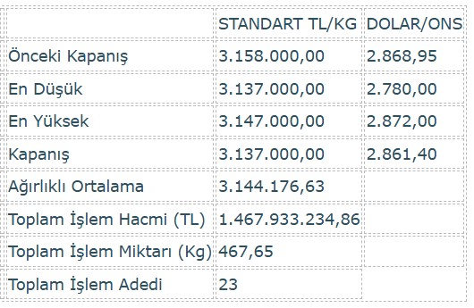 Tüm metallerde toplam işlem hacmi ise 1 milyar 482 milyon 550 bin 612,52 lira düzeyinde gerçekleşti.
