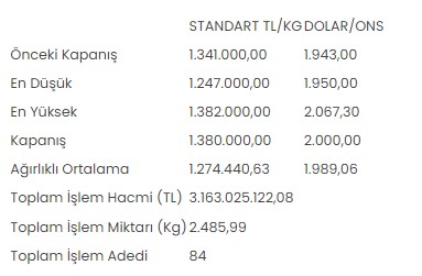Tüm metallerdeki toplam işlem hacmi de 3 milyar 258 milyon 815 bin 968,52 lira düzeyinde gerçekleşti.