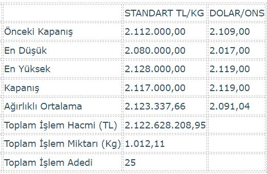 Tüm metallerde toplam işlem hacmi ise 2 milyar 147 milyon 124 bin 643,28 lira düzeyinde gerçekleşti.