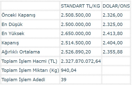Tüm metallerde toplam işlem hacmi de 2 milyar 335 milyon 424 bin 675,42 lira düzeyinde gerçekleşti.