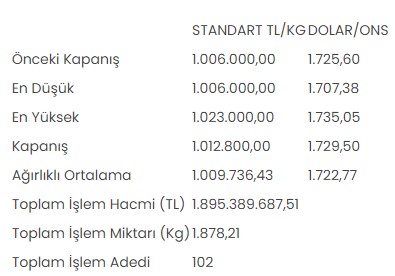 KMKTP'de, altında gerçekleşen toplam işlem hacmi 1 milyar 895 milyon 389 bin 687,51 lira, işlem miktarı ise 1.878,21 kilogram oldu.