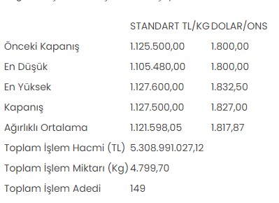 Altın piyasasında, en düşük 1 milyon 105 bin 480 lira, en yüksek 1 milyon 127 bin 600 lirayı gören standart altının kilogram fiyatı, günü önceki kapanışa göre yüzde 0,2 artışla 1 milyon 127 bin 500 liradan tamamladı.