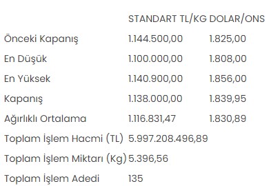 Altın piyasasında, en düşük 1 milyon 100 bin lira, en yüksek 1 milyon 140 bin 900 lirayı gören standart altının kilogram fiyatı, günü önceki kapanışa göre yüzde 0,57 azalarak 1 milyon 138 bin liradan tamamladı.