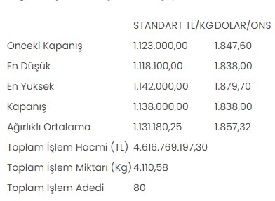 Altın piyasasında, en düşük 1 milyon 118 bin 100 lira, en yüksek 1 milyon 142 bin lirayı gören standart altının kilogram fiyatı, günü önceki kapanışa göre yüzde 1,3 artarak 1 milyon 138 bin liradan tamamladı.