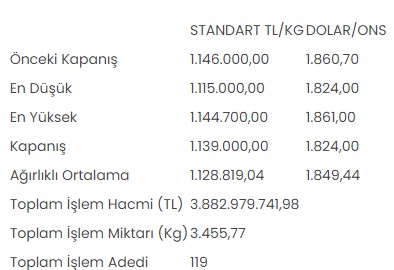 Altın piyasasında, en düşük 1 milyon 115 bin lira, en yüksek 1 milyon 144 bin 700 lirayı gören standart altının kilogram fiyatı, günü önceki kapanışa göre yüzde 0,6 azalarak 1 milyon 139 bin liradan tamamladı.