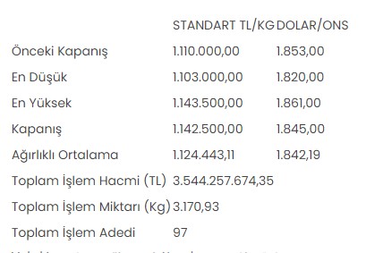 Altın piyasasında, en düşük 1 milyon 103 bin lira, en yüksek 1 milyon 143 bin 500 lirayı gören standart altının kilogram fiyatı, günü önceki kapanışa göre yüzde 2,93 artarak 1 milyon 142 bin 500 liradan tamamladı.