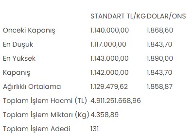 Borsa İstanbul Kıymetli Madenler ve Kıymetli Taşlar Piyasası'nda (KMKTP), altında gerçekleşen toplam işlem hacmi 4 milyar 911 milyon 251 bin 668,96 lira, işlem miktarı ise 4.358,89 kilogram oldu.