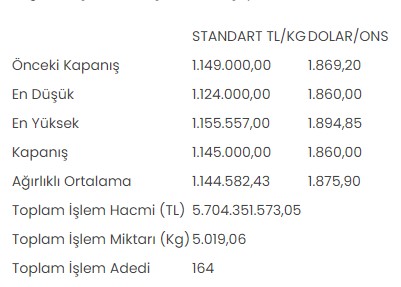 Tüm metallerdeki toplam işlem hacmi de 5 milyar 711 milyon 769 bin 882,25 lira düzeyinde gerçekleşti.