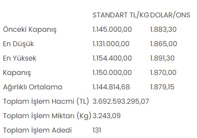 Altın piyasasında, en düşük 1 milyon 131 bin lira, en yüksek 1 milyon 154 bin 400 lirayı gören standart altının kilogram fiyatı, günü önceki kapanışa göre yüzde 0,4 artarak 1 milyon 150 bin liradan tamamladı.