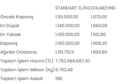 Borsa İstanbul Kıymetli Madenler ve Kıymetli Taşlar Piyasası'nda (KMKTP), altında gerçekleşen toplam işlem hacmi 7 milyar 752 milyon 986 bin 687,30 lira, işlem miktarı ise 6.762,49 kilogram oldu.