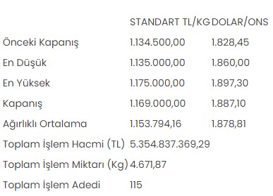 Borsa İstanbul Kıymetli Madenler ve Kıymetli Taşlar Piyasası'nda (KMKTP), en düşük 1 milyon 135 bin lira, en yüksek 1 milyon 175 bin lirayı gören standart altının kilogram fiyatı, günü önceki kapanışa göre yüzde 3,1 artışla 1 milyon 169 bin liradan tamamladı.