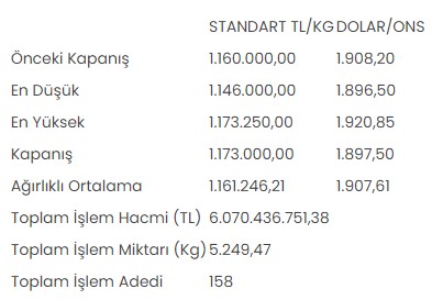 Altın piyasasında, en düşük 1 milyon 146 bin lira, en yüksek 1 milyon 173 bin 250 lirayı gören standart altının kilogram fiyatı, günü önceki kapanışa göre yüzde 1,12 artarak 1 milyon 173 bin liradan tamamladı.