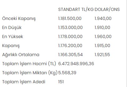 Altın piyasasında, en düşük 1 milyon 153 bin lira, en yüksek 1 milyon 178 bin lirayı gören standart altının kilogram fiyatı, günü önceki kapanışa göre yüzde 0,45 azalarak 1 milyon 176 bin 200 liradan tamamladı.