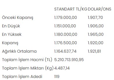 Tüm metallerdeki toplam işlem hacmi de 5 milyar 228 milyon 522 bin 257,12 lira düzeyinde gerçekleşti.