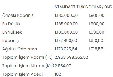 Tüm metallerdeki toplam işlem hacmi de 3 milyar 88 milyon 747 bin 774,85 lira düzeyinde gerçekleşti.