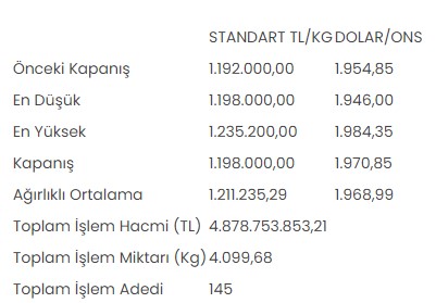 Altın piyasasında, en düşük 1 milyon 198 bin lira, en yüksek 1 milyon 235 bin 200 lirayı gören standart altının kilogram fiyatı, günü önceki kapanışa göre yüzde 0,5 artarak 1 milyon 198 bin liradan tamamladı.