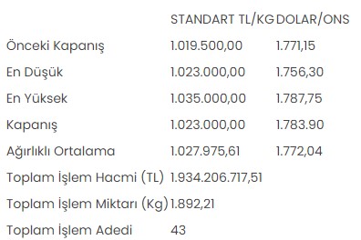 KMKTP'de, altında gerçekleşen toplam işlem hacmi 1 milyar 934 milyon 206 bin 717,51 lira, işlem miktarı ise 1.892,21 kilogram oldu.